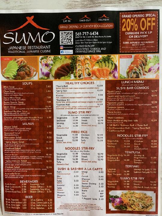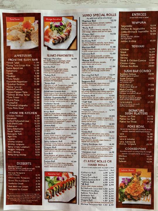 From a reviewer’s perspective, the menu at Sumo Sushi & Japanese offers an impressively wide selection that caters to both traditional and modern tastes, even though specific prices aren’t listed. The noodle section stands out with flavorful options like Shrimp Yaki Soba and Steak Yaki Soba, while the entrée lineup features satisfying classics such as Chicken Teriyaki and the more premium Chilean Sea Bass Teriyaki. Sushi lovers will appreciate the creative flair of the Volcano Roll, Rudy Roll, and indulgent Lobster Supreme Roll, alongside lighter choices like the Jerry Roll and Sashimi Roll. Appetizers such as Gyozas, Shrimp Tempura App, and Grilled Yellowtail Jaw provide a strong start, while heartier dishes like Chicken Pad Thai, Beef Red Curry, and Steak Fried Rice add variety beyond sushi. The menu also includes comforting soups like Miso Soup and Sumo Special Soup, as well as shareable options like the Platter For Two or Sushi Deluxe combos. To round things out, desserts such as Tempura Ice Cream and Cheesecake Tempura offer a sweet finish. Overall, the breadth of dishes-from Tuna & Salmon Poke Bowl to Filet Mignon Hibachi-makes the menu feel both diverse and thoughtfully curated, appealing to a wide range of diners.